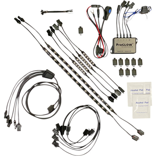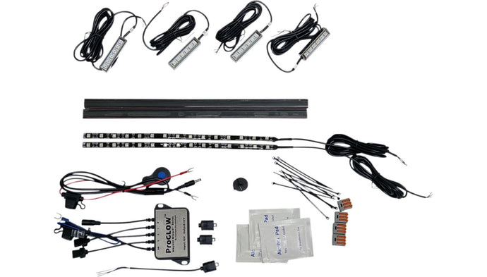 Engine kit (two 15-LED strips, four 6-LED strips). Pre-taped for easy mounting. Kit includes ProGlow Bluetooth controller, wire splitters, caps and extensions. Plug-and-play.